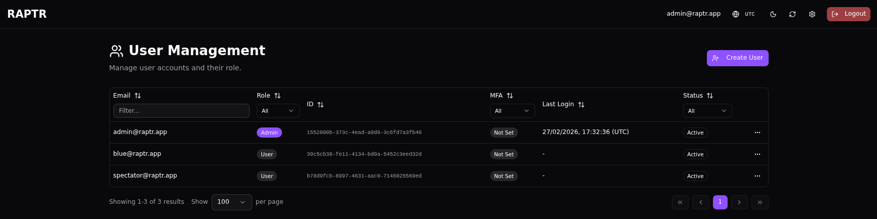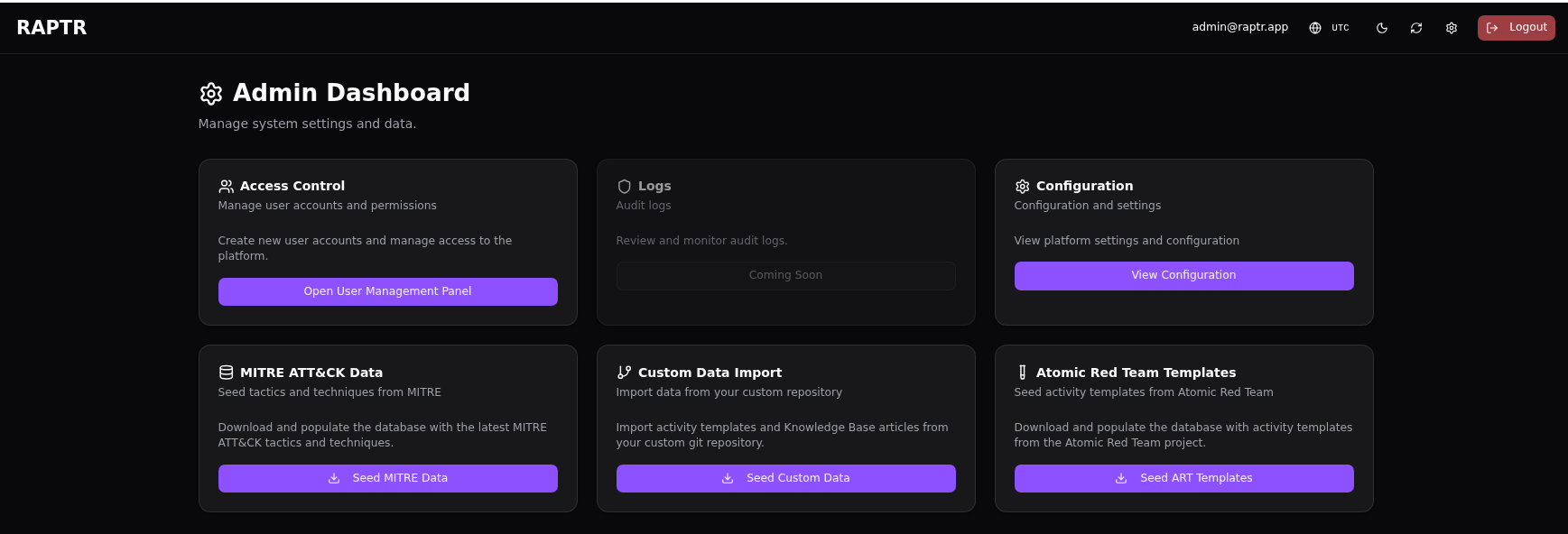 This section covers in-app administration tasks that require the Admin system role. These are features accessed from the admin panel within RAPTR itself.